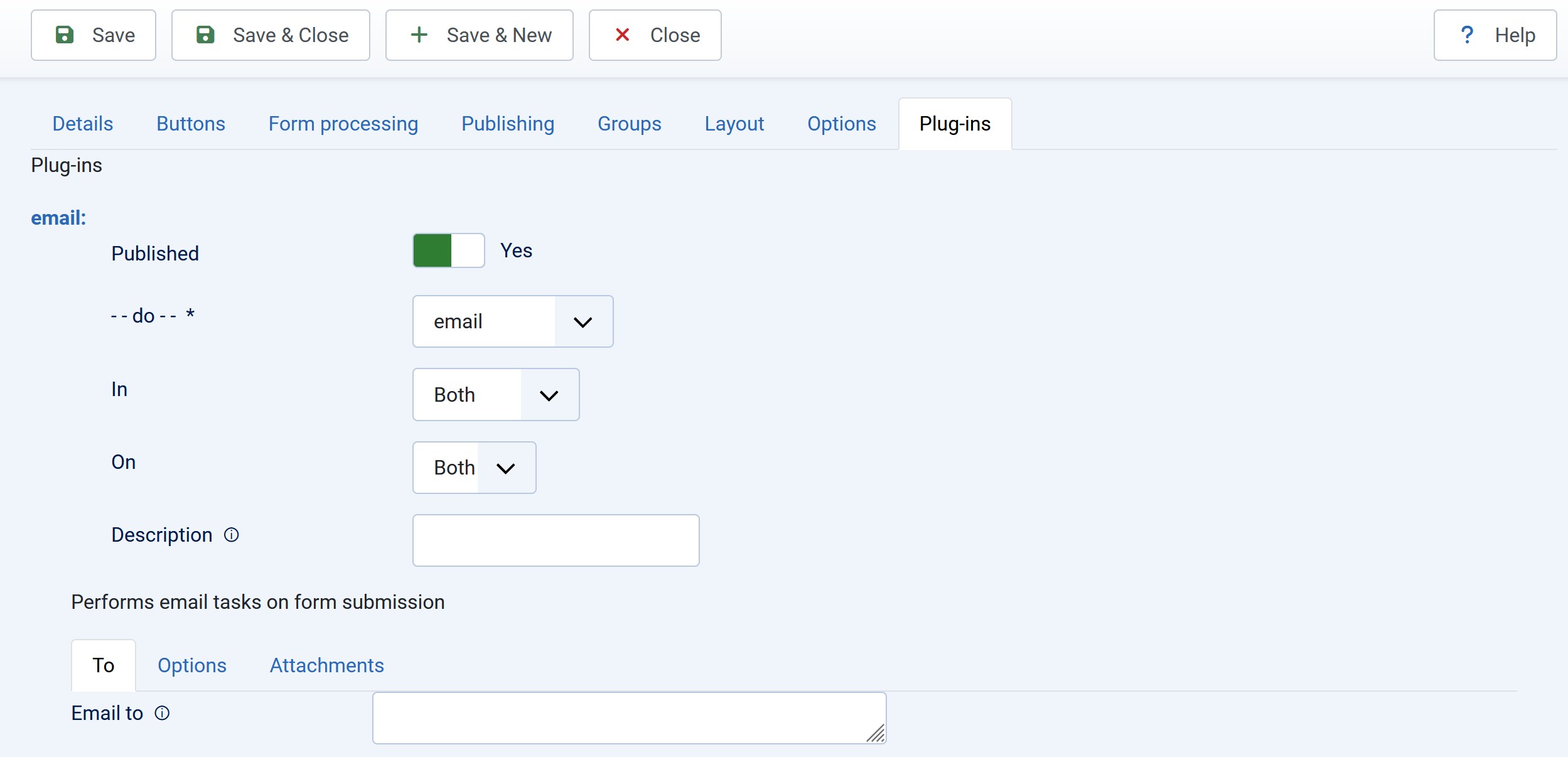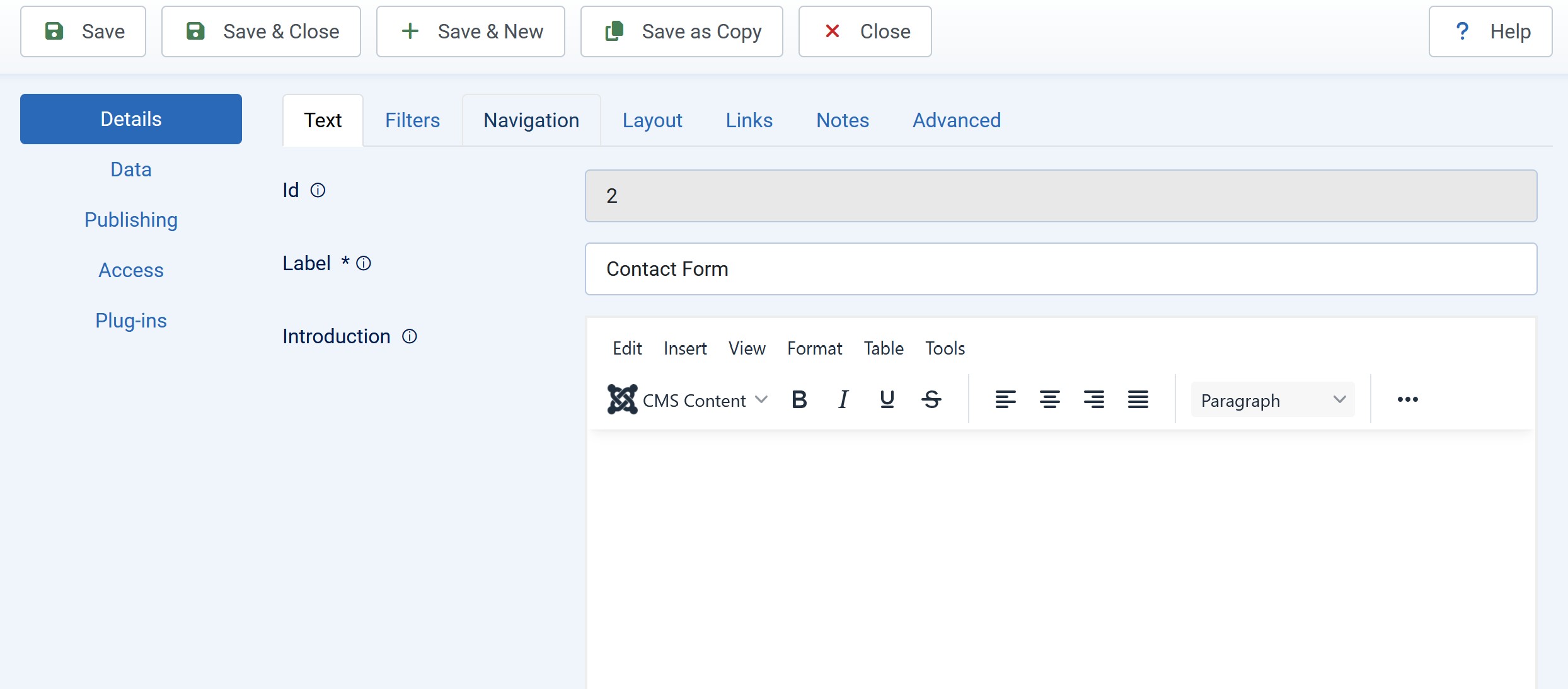 - Go to Fabrik > Forms and click on the contact form you created previously.